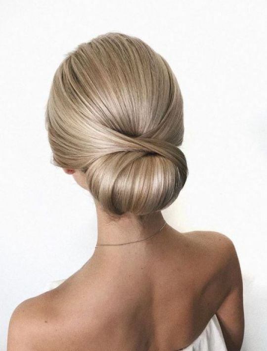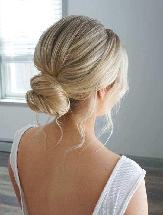 Der elegante niedrige Dutt ist ideal für alle, die einen schlichten, schicken und zeitlosen Look suchen. Diese Frisur, die im Nacken positioniert wird, verkörpert diskrete Raffinesse. Sie ist die erste Wahl für eine schlichte Silhouette und betont auf elegante Weise die Linie des Halses und des Rückens.