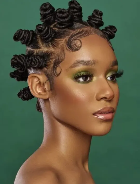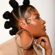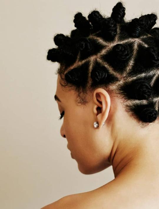 Bantu Knots sind ideal für einen gewagten und schützenden Look, der die Schönheit von strukturiertem Haar unterstreicht. Bei dieser traditionellen Frisur werden die Haarsträhnen zu kleinen, eleganten Knoten gewickelt, was einen grafischen und modernen Stil ergibt und gleichzeitig die natürliche Feuchtigkeit des Haares bewahrt.